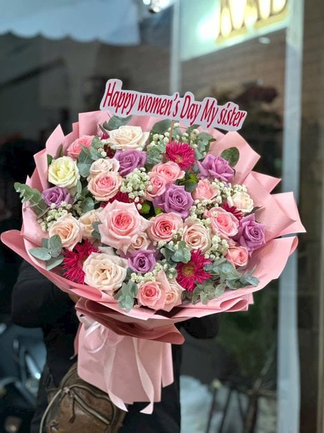 Bó hoa là sự kết hợp hài hòa giữa các gam màu lãng mạn, nổi bật nhưng không chói lóa, bao gồm: