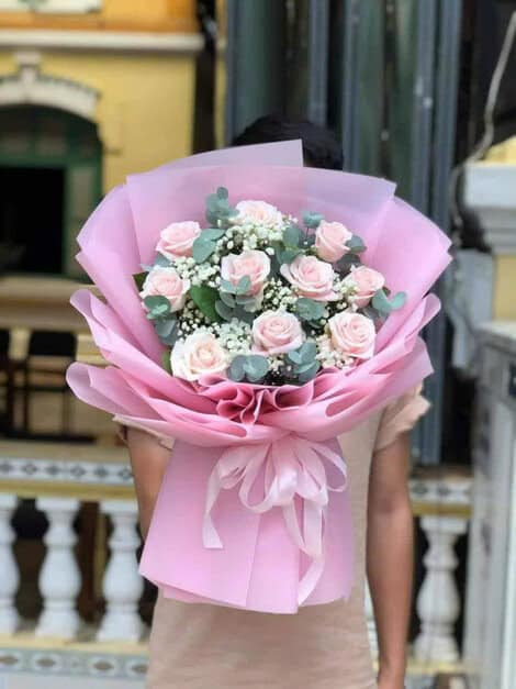 Bó hoa nổi bật với những đóa hoa hồng phấn dịu dàng kết hợp cùng hoa xanh baby và điểm nhấn hoa nhỏ vàng tươi, được gói trong lớp giấy pastel hồng – xanh sang trọng. Tổng thể bó hoa mang vẻ đẹp tinh tế, ngọt ngào và đầy cảm xúc, phù hợp cho những khoảnh khắc yêu thương đáng nhớ.
